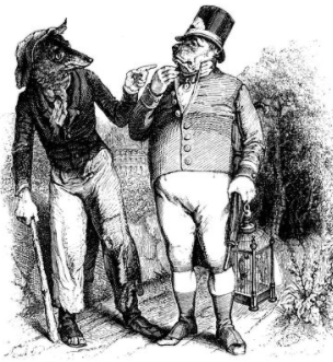 Et puis, à bien y regarder, le Loup est aussi la parfaite victime émissaire d’un système fondé sur la domestication des plantes, des troupeaux et des humains. Il n’est certes pas mis à mort en l’occurrence, mais seulement exclu du système, du moins dans l’attente d’une prochaine battue. Les os à ronger de poulet et de de pigeon, espèces domestiquées elles aussi, sont réservés aux Chiens et inaccessibles au Loup, sauf à ce qu’il attaque poulailler ou pigeonnier au risque de sa vie. Les Chiens sont d’ailleurs les gardiens zélés de cet espace de domestication généralisé et l’interdisent au Loup (les chiens faisaient bonne garde). Le Loup est dans l’imaginaire occidental l’incarnation principale de la menace pour l’ordre domestique : les loups sont pratiquement les seuls prédateurs de grande taille (avec quelques ours) à avoir conservé un minimum de zones de chasse dans la nature européenne (espaces au demeurant longtemps en voie de réduction et tout juste de nouveau en voie de déconfinement). Par ailleurs, la préhistoire et la génétique nous ont appris que les chiens sont des loups domestiqués, premiers collaborateurs des hommes du Paléolithique : la question de la domestication est donc centrale non seulement dans la fable mais dans l’histoire des canidés. Ou les loups deviennent des chiens ou ils restent les responsables de nombre des maux dont les éleveurs de bétail ont à souffrir.