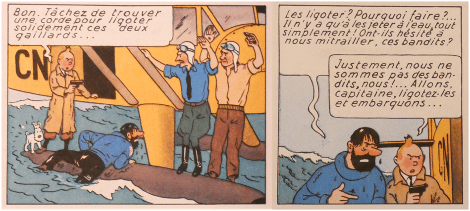 Les planches ci-dessus sont tirées du « Crabe aux pinces d’or ». La première édition en couleurs date de 1943. Tintin et Haddock, rescapés dans un canot de sauvetage, viennent de se faire mitrailler. Tintin réplique avec un pistolet ; il endommage l’hydravion, obligé d’amerrir. Tintin réussit à prendre le contrôle de la situation. Mais que faire des pilotes ?