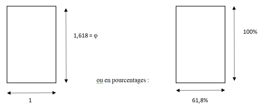 Parmi l’infinité de rectangles que vous pouvez dessiner, se trouve celui dit « Rectangle d’or » ; ainsi nommé parce que la proportion entre son grand côté et son petit côté est celle du Nombre d’or. Un petit croquis vaut mieux qu’un long discours :