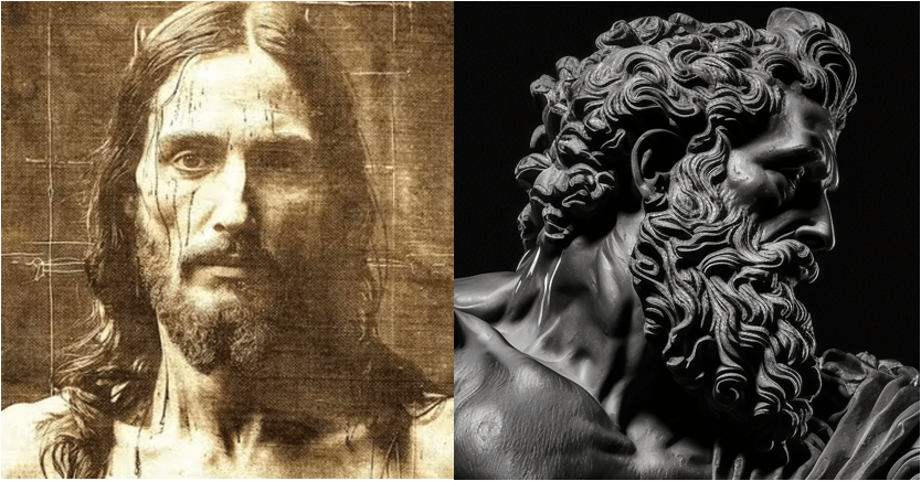 Ndlr : l’illustration pour Jésus a été réalisée par une Intelligence Artificielle à partir du Suaire de Turin.