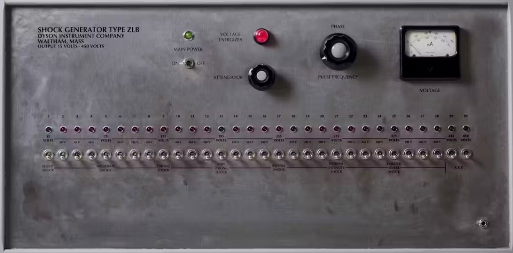 Il s’agit en effet, ni plus ni moins, pour les « sujets » volontaires qui participent à cette expérience, d’infliger des décharges électriques à l’un des leurs, en graduant l’intensité de celles-ci jusqu’à un seuil considéré comme dangereux. Pour les lecteurs du blogue qui seraient nés trop tard pour avoir été informés, c’est-à-dire secoués, « électrisés » par le récit d’une telle expérimentation, organisée et vécue dans le cadre rassurant d’un laboratoire de recherche (à Yale), j’explique : le docteur Stanley Milgram, né en 1934 à New-York de parents juifs venus de Hongrie et de Roumanie, se pose une question qui taraude encore beaucoup de monde : comment une foule de gens ordinaires (comme Eichmann, extraordinairement ordinaire) ont-ils pu participer activement à la Shoah ? Et pour comprendre les ressorts de l’obéissance aveugle, ce brillant chercheur a inventé la fameuse « expérience de Milgram ».